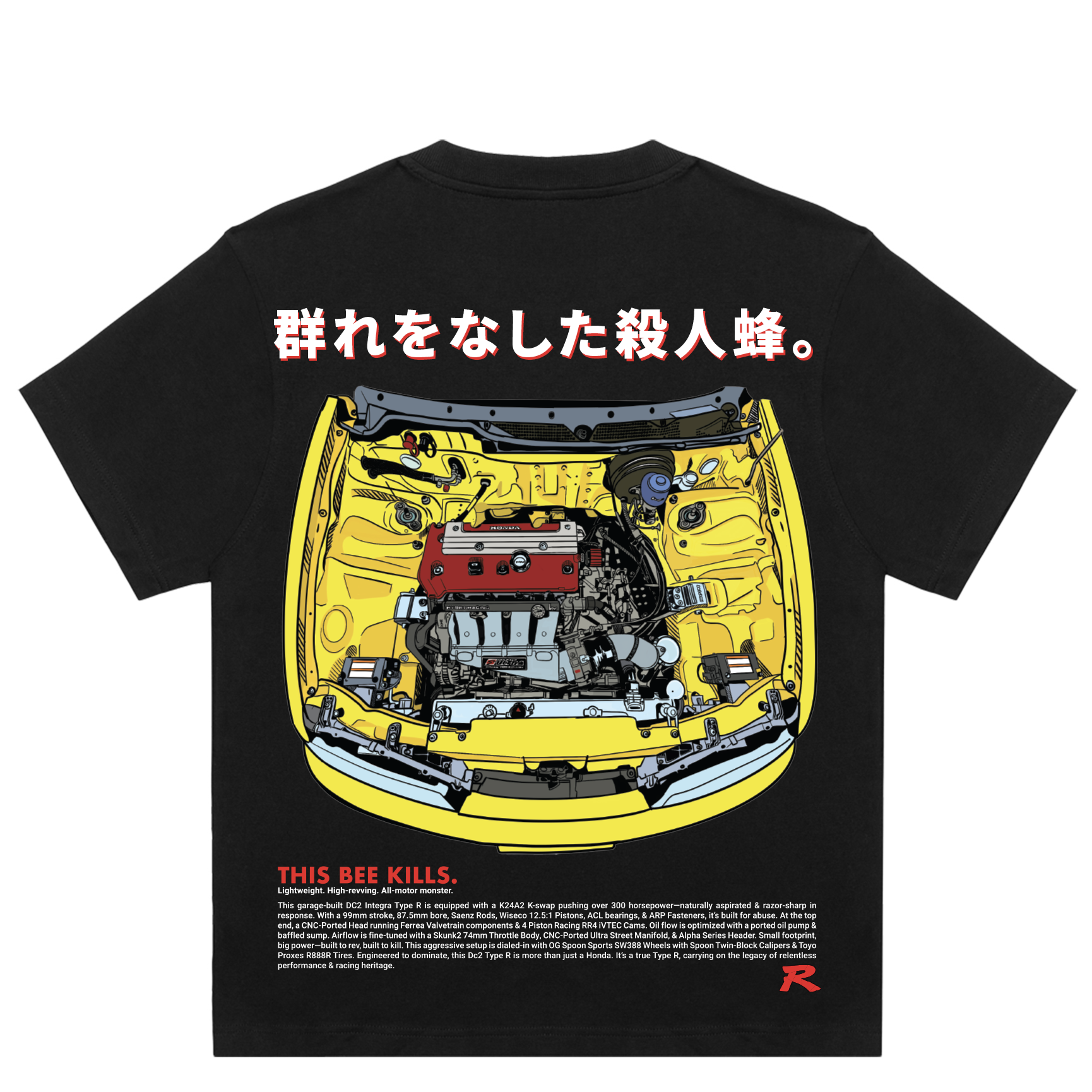 Built around the legendary Honda/Acura Integra Type R this design showcases a detailed K-series engine bay in iconic Phoenix Yellow. Topped with Japanese text meaning “Killer bee on a swarm.” Represents lightweight engineering, precision, and the relentless spirit of the Type R.